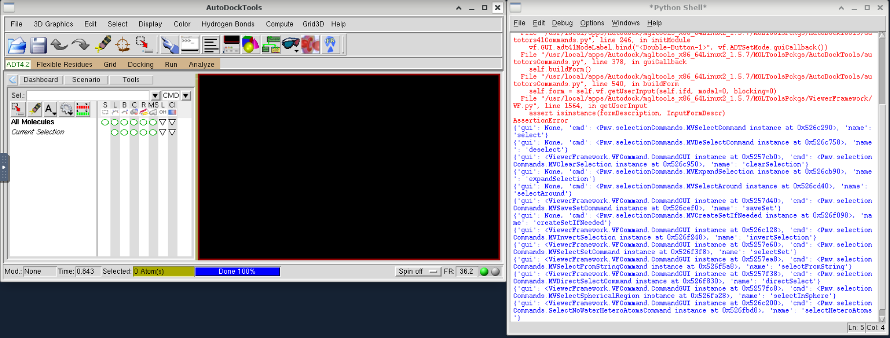 [user@cn3144 ~]$ module load Autodock [+] Loading Autodock 4.2.6 ... [user@cn3144 ~]$ adt setting PYTHONHOME environment Run ADT from /usr/local/apps/Autodock/mgltools_x86_64Linux2_1.5.7/MGLToolsPckgs/AutoDockTools MSMSLIB 1.4.4 started on cn2063 Copyright M.F. Sanner (March 2000) Compilation flags