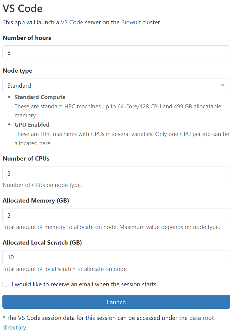 To access VS Code via Open OnDemand, you navigate to the VS Code application page, configure the resources your job requires, and launch your job.